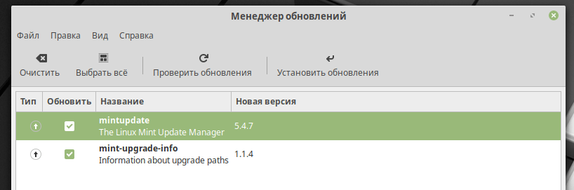 Если есть обновления для пакетов mintupdate и mint-upgrade-info, то отметьте их галочками и нажмите кнопку Установить обновления