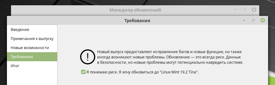 Вам требуется только нажимать кнопку Следующая ( Next ) . На предпоследнем шаге установите галочку у пункта « Я понимаю риск. Я хочу обновиться до Linux Mint.. » и нажать кнопку Применить .