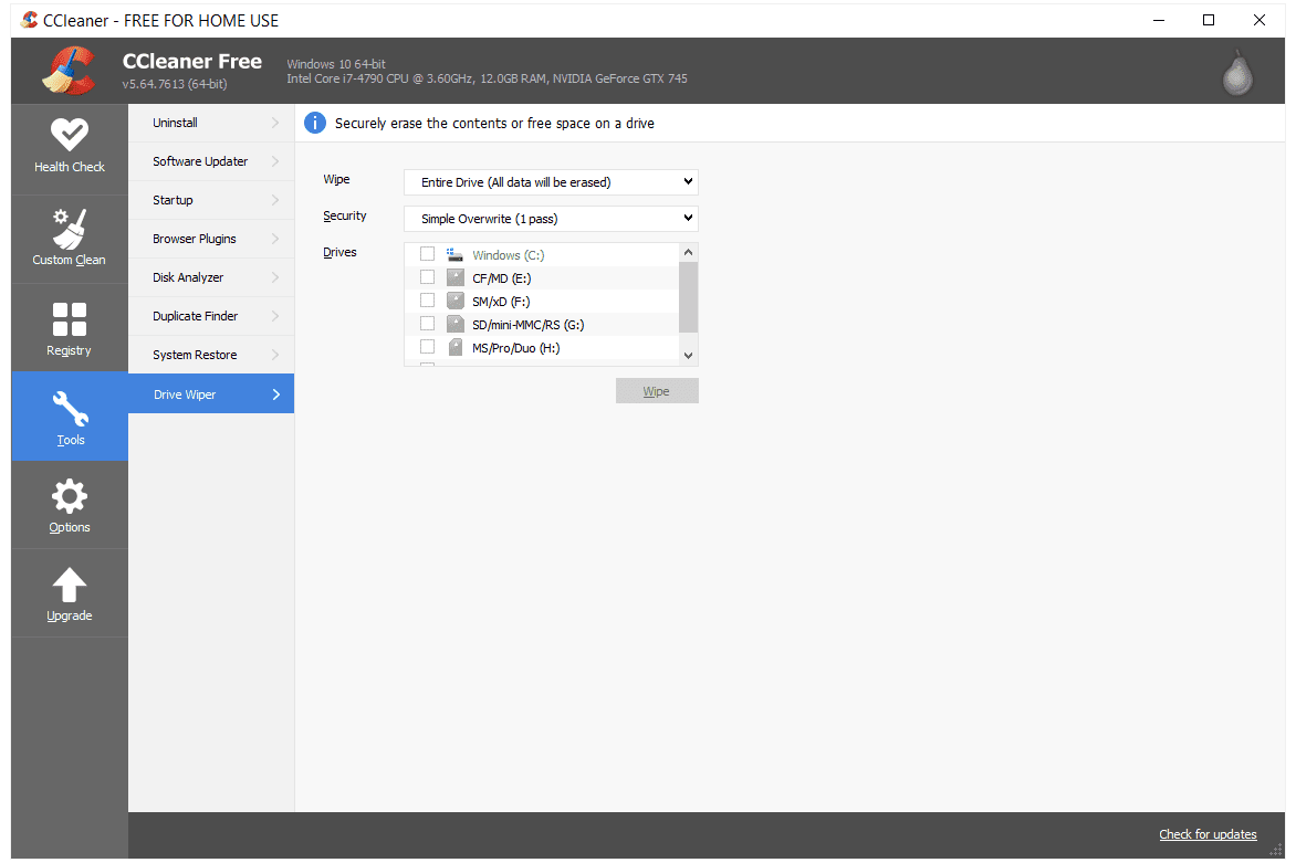 Хотя CCleaner обычно используется в качестве системного очистителя для удаления временных файлов Windows и других файлов Интернета или кэша , он также содержит инструмент, который может стереть свободное дисковое пространство или полностью уничтожить все данные на диске.