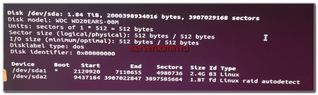Далее через fdisk я увидел разделы диска sda, в том числе тот, что меня интересовал — Linux raid autodetect.