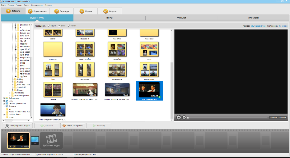 В открывшемся меню редактора сверху выберите пункт 1 «Добавить» и выберите видео, которое хотите перевернуть. С зажатой левой кнопкой мышки перенесите