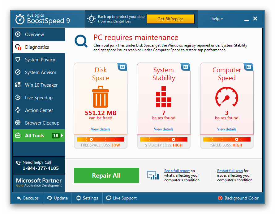 При запуске программы осуществляется автоматическая проверка. Программа выдает оценку состояния системы (все плохо) и определяет, сколько и чего можно удалить. Чтобы исправить обнаруженные проблемы, нажимайте “Исправить все” (Repair all).