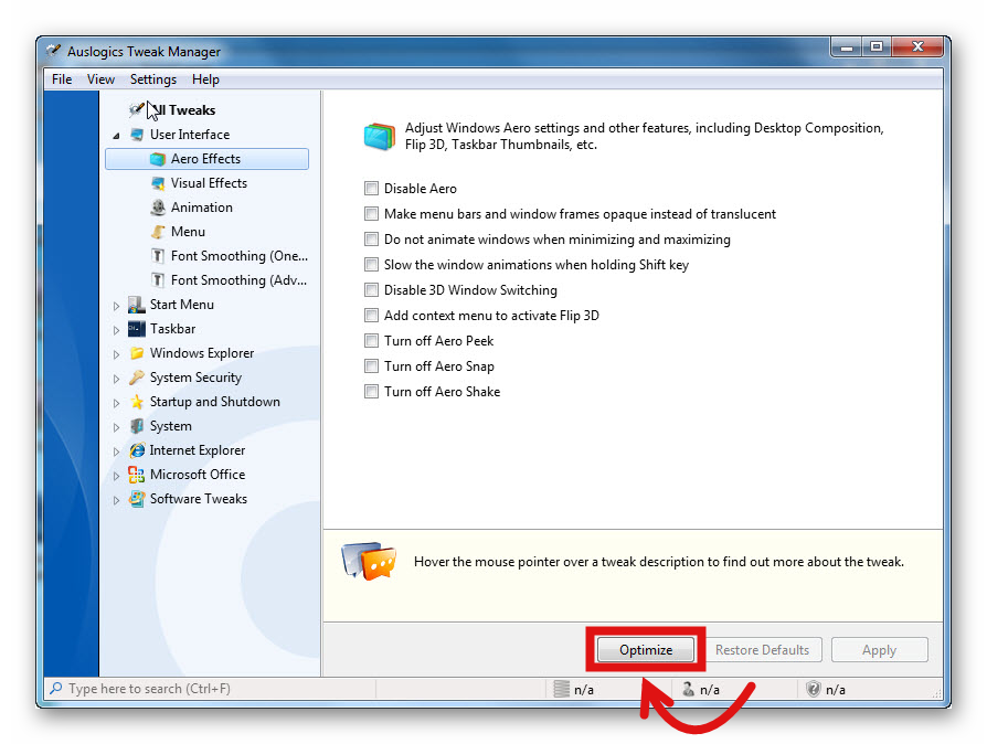 - Tweak Manager – здесь есть возможность оптимизации визуального интерфейса для достижения максимального быстродействия: визуальные эффекты, задержка на появление подменю, анимации и сглаживание шрифтов. Чтобы не настраивать все вручную, нажмите “Оптимизация” (Optimize) внизу окна и, когда программа выставит нужные галочки, нажмите “Применить” (Apply). Кроме визуального интерфейса, есть возможность оптимизации загрузки системы (Startup and Shutdown), но, как правило, сервер постоянно находится в рабочем режиме и перезагружать его нужно не так часто.