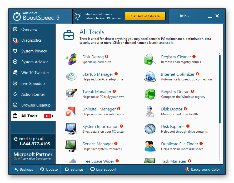 Помимо основных функций программы, много полезных утилит содержит вкладка “Инструменты” (All Tools). Здесь расположен список вспомогательных инструментов для оптимизации работы системы.