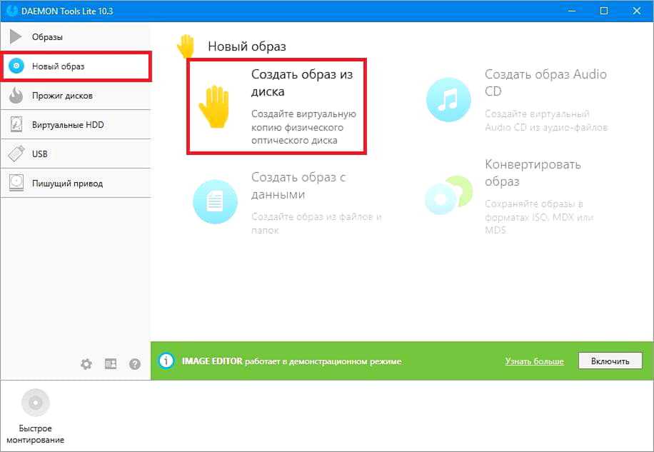 Этот «Дисковод BD-ROM» как раз и является приводом рассматриваемой программы DAEMON Tools Lite. В этом примере мы создадим image оригинального установочного DVD-диска с операционной системой Windows 10. Чтобы сделать из установочного DVD с десяткой образ, вставим его в DVD-привод. Теперь запустим утилиту и перейдем в раздел «Новый образ».