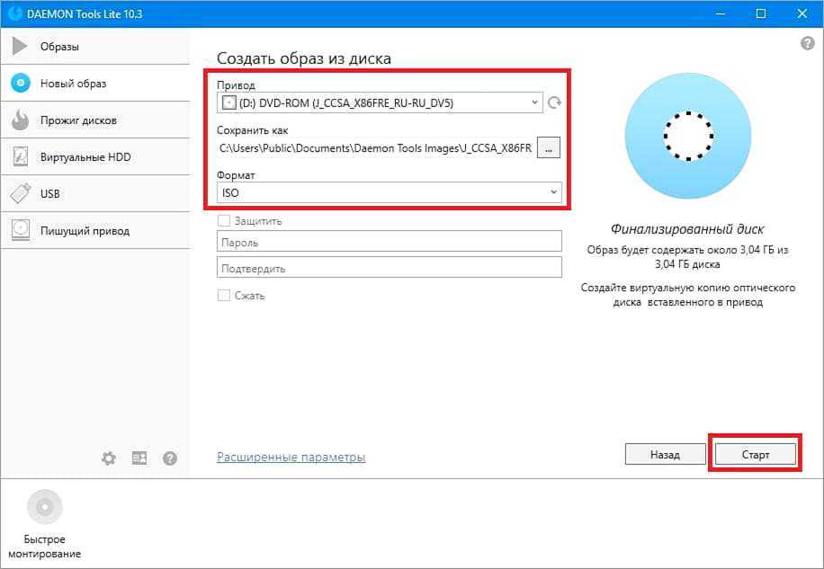 Также выберем формат image ISO и подтвердим создание, нажав кнопку Старт, что запустит создание образа DVD-диска с Windows 10.