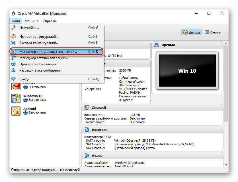На панели меню выберите «Файл» > «Менеджер виртуальных носителей» или просто нажмите Ctrl+D.