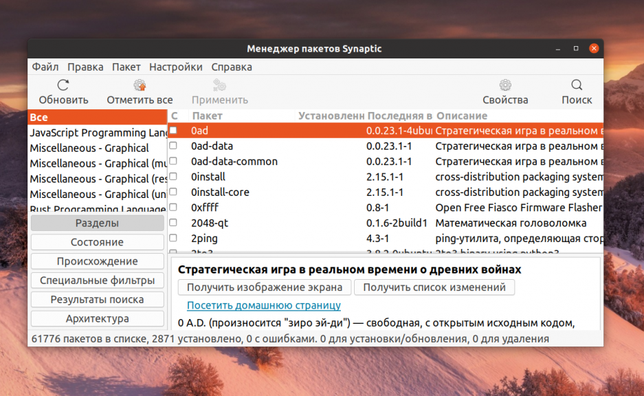 Synaptic — это графический менеджер пакетов linux, написанный на GTK и использующий apt в качестве бэкенда. Он отлично подходит для пользователей, которые не хотят работать в командной строке. Здесь есть все те же необходимые функции что и в apt.
