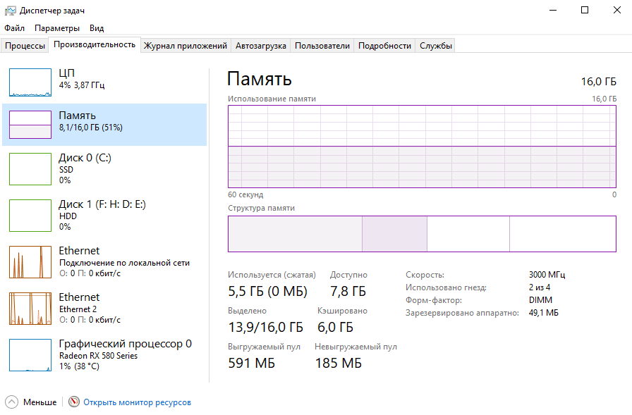 Например, в диспетчере задач показывает кэшировано 6.0 Гб. В строке Структура памяти смотрим Зарезервировано (5832 Мб). Это и есть память, содержащая кэшированные данные и код, которые прямо сейчас не используются.