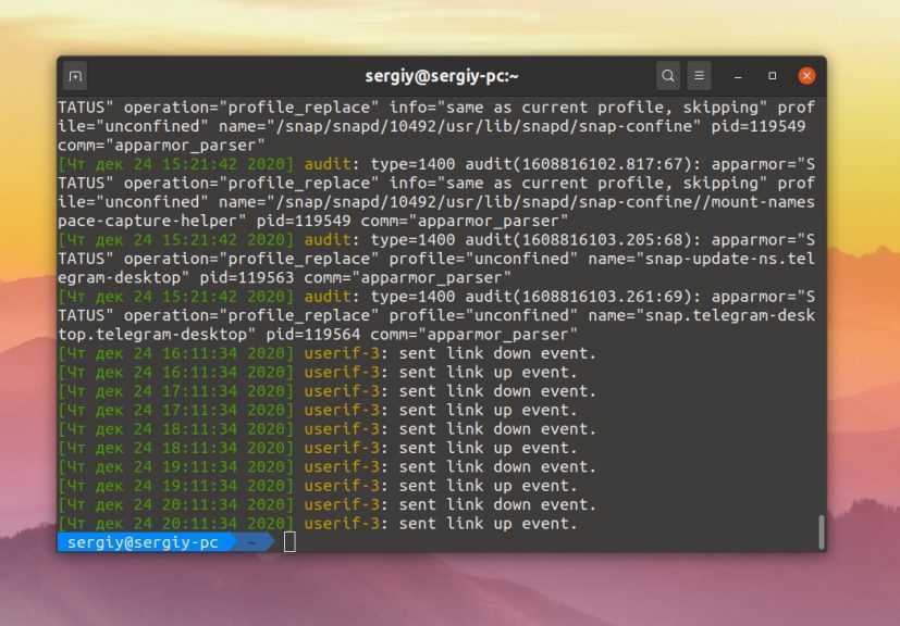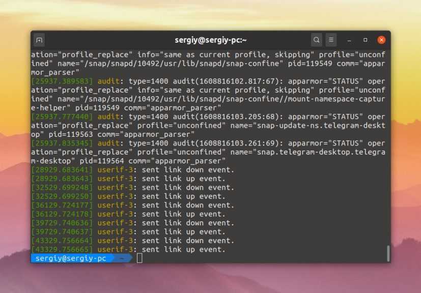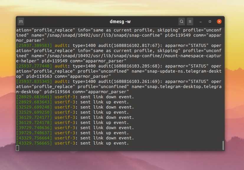Теперь в выводе утилиты не будет сообщений от Systemd. Если вы хотите выводить все сообщения ядра в реальном времени, используйте опцию -w: