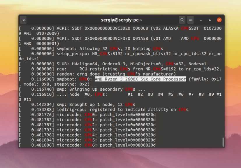 Во время загрузки ядро тестирует оборудование и выводит подробную информацию о нём в буфер сообщений ядра. Таким образом, с помощью dmesg можно посмотреть информацию об оборудовании, просто отфильтруйте нужные данные, например CPU: