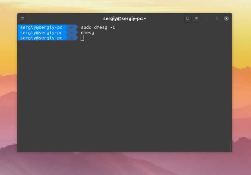 Аналогичным образом вы можете фильтровать и другие категории. Если вы хотите очистить буфер сообщений ядра, используйте опцию -C. При следующем запуске dmesg там будет пусто: