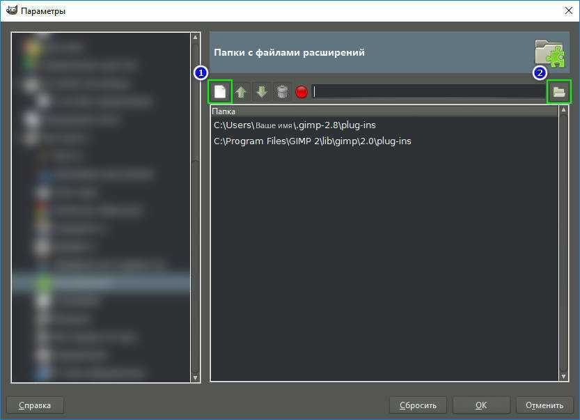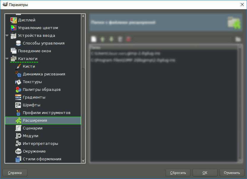 В левой колонке окна параметров раскройте папку Каталоги и выделите каталог с именем Расширения (в GIMP 2.10 — каталог с именем Плагины).