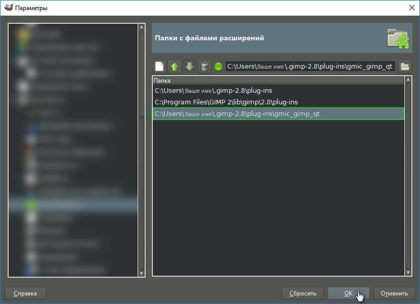 В списке подключенных каталогов появится ссылка на папку с файлами расширения G’MIC. Нажмите ОК.