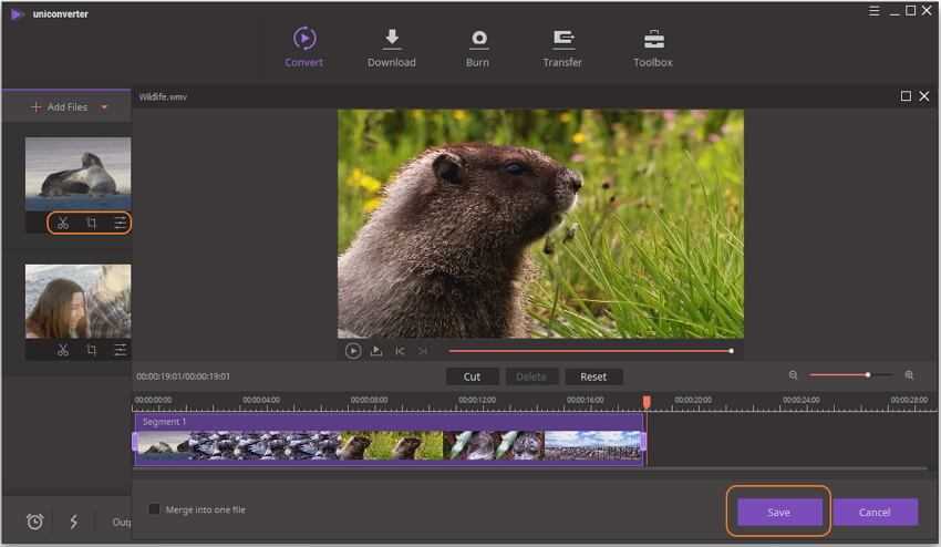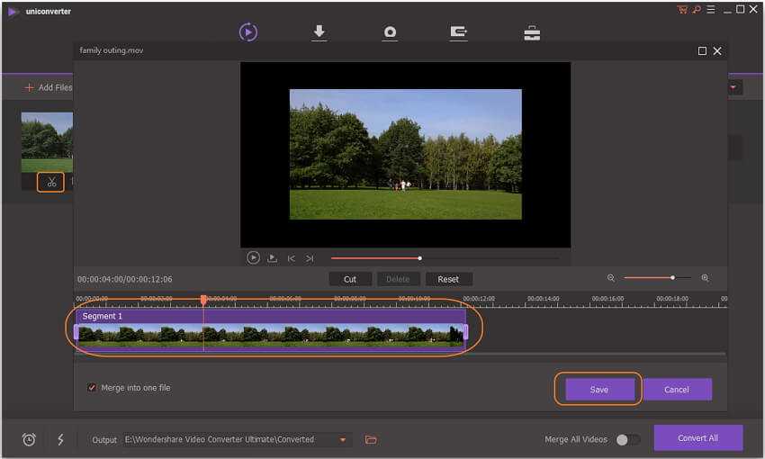 Вы можете кадрировать или обрезать ненужные фрагменты MOV видео, что поможет вам уменьшить ваш файл в размере. Wondershare UniConverter может укоротить, кадрировать и обрезать видео в режиме предварительного просмотра. Щелкните иконку Trim возле миниатюры видео, и вы откроете окно редактирования. Обрежьте длину MOV видео и нажмите на кнопку Сохранить для подтверждения всех изменений. Либо вы можете обрезать черные края с помощью иконки Кадрировать.