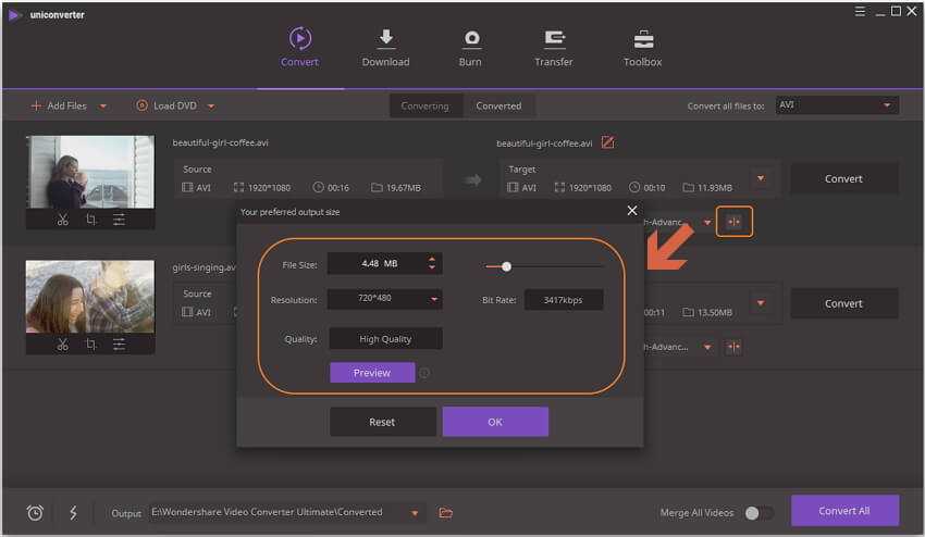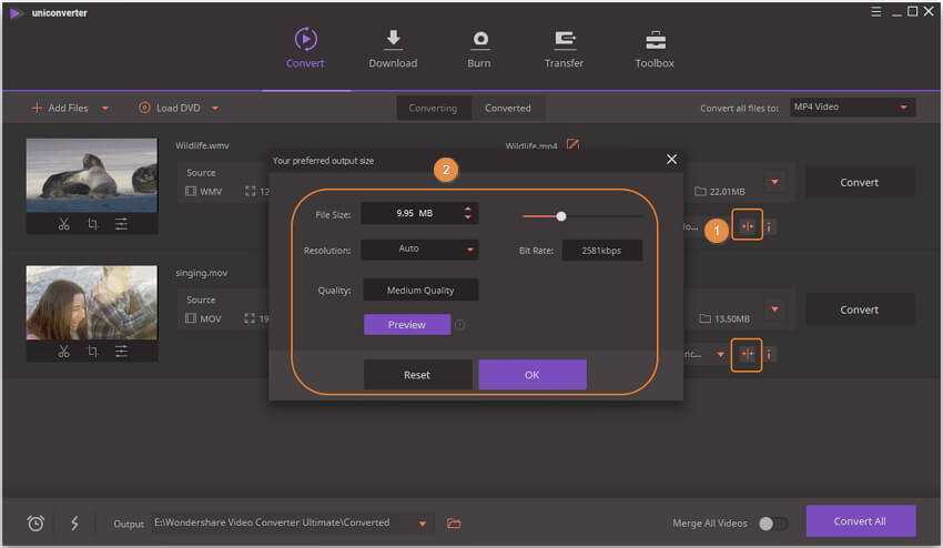 С попомщью Wondershare UniConverter Вы можете уменьшить видео тремя способами: выбрать формат видео, который поддерживает меньший размер файла, обрезать видео по времени или по сторонам с помощью интуитивных функций для редактирования, настроить такие параметры видео как разрешение, частоту кадров, энкодер и др.