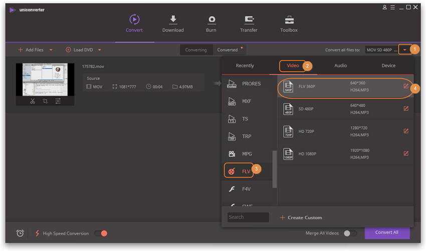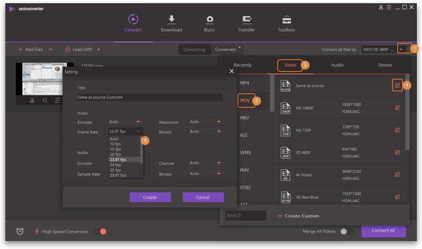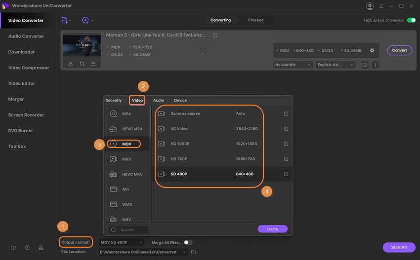 Вы можете выбрать выходной формат видео, щелкнув по Конвертировать все файлы в:. Кликните по выпадающему списку, чтобы открыть список форматов, а затем нажмите на вкладку Видео, чтобы найти формат MOV и выбрать разрешение. Вы можете конвертировать ваше видео в другой формат, если это необходимо.