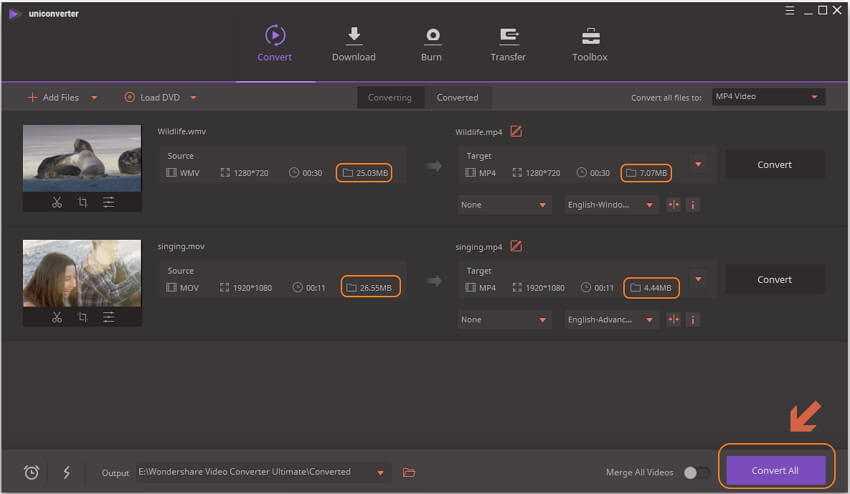 Наконец, нажмите кнопку Конвертировать, чтобы приступить к сжатию MP4 файлов. Чтобы сжать несколько файлов MP4 за один раз, нажмите кнопку Конвертировать все. После этого все файлы будут сжаты согласно указанным параметрам. Этот метод пакетного сжатия также работает на Windows.
