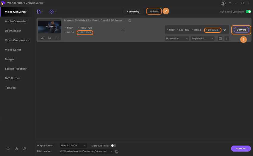 После применения настроек Ваш файл MOV будет уменьшен, затем нажмите на кнопку Конвертировать все, для того чтобы конвертировать и сохранить вновь сжатые файлы MOV. Чтобы перейти к вашим уменьшенным конвертированным файлам MOV после завершения процесса конвертации Вы можете переключиться во вкладку Конвертированные.