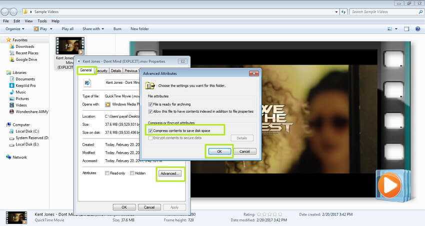 Один из самых простых способов уменьшить размер файла MOV — это сжать его содержимое. Для этого найдите нужный MOV-файл и, щелкнув правой кнопкой, выберите Свойства. Затем перейдите в Общие > Другие. Поставьте галочку рядом с Сжимать содержимое для экономии места на диске. После этого щелкните OK и файл будет сохранен в уменьшенном размере.
