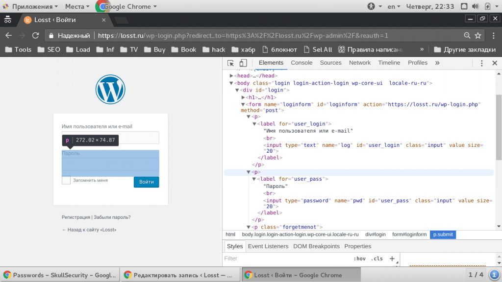 Самый сложный вариант — это перебор паролей для веб-форм. Здесь нам нужно узнать что передает на сервер нужная форма в браузере, а затем передать в точности те же данные с помощью hydra. Вы можете посмотреть какие поля передает браузер с помощью перехвата в wireshark, tcpdump, в консоли разработчика и так далее. Но проще всего открыть исходный код формы и посмотреть что она из себя представляет. Далеко ходить не будем и возьмем форму WordPress: