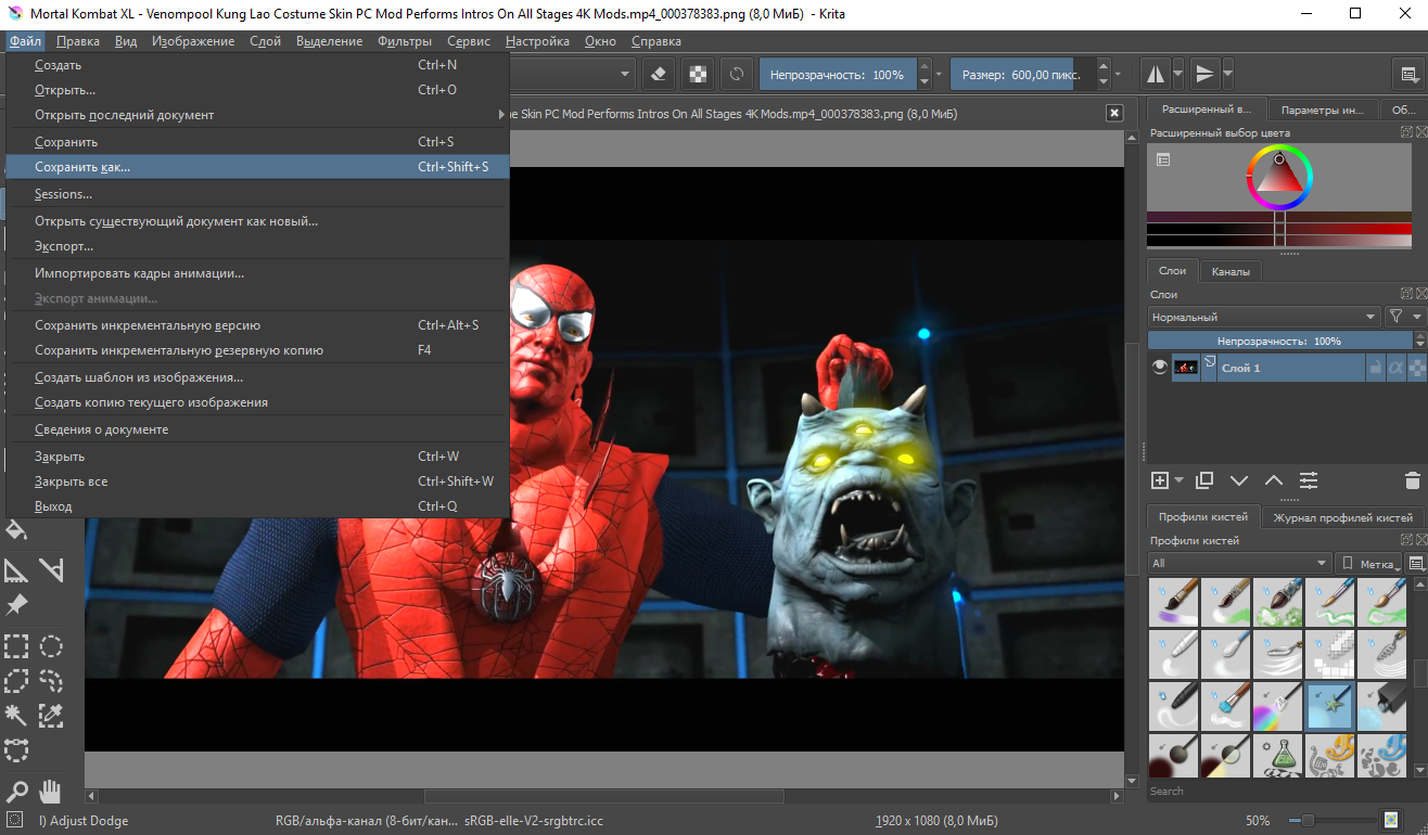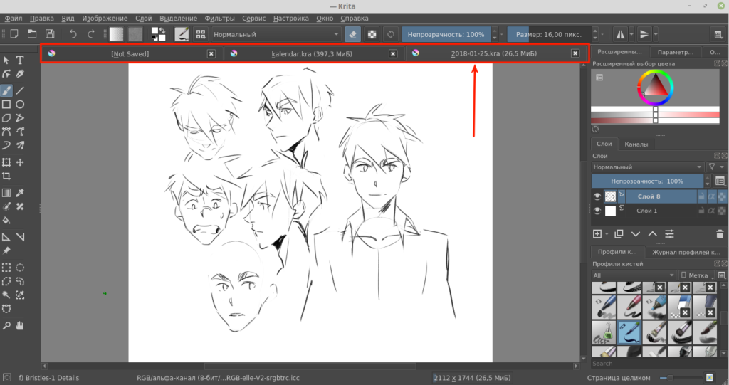 Обратите внимание, что Krita может одновременно открывать несколько файлов в одном окне. Чтобы переключиться между открытыми файлами используйте вкладки сверху
