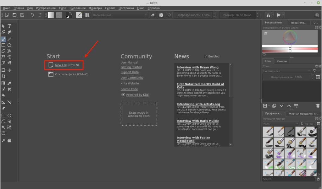 Чтобы запустить Krita дважды щёлкните на иконку программы на рабочем столе: