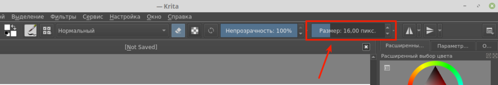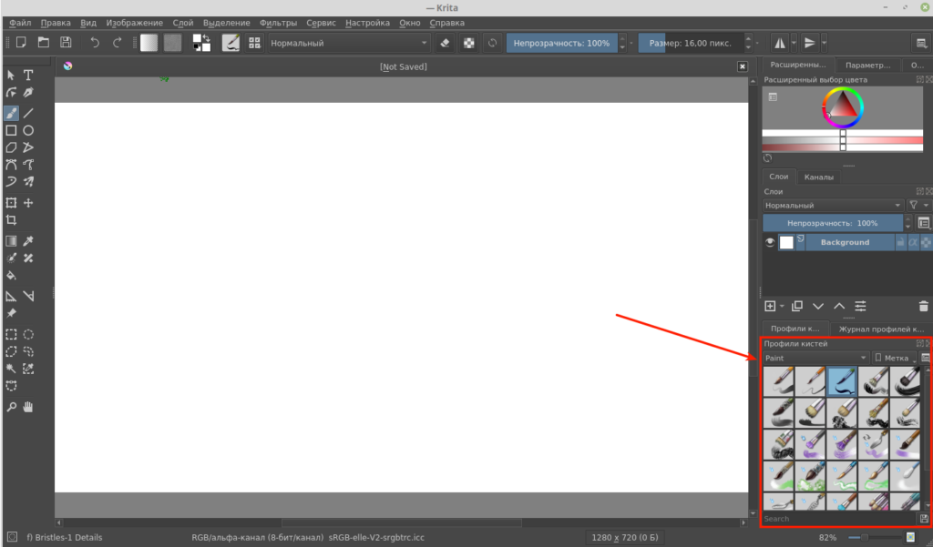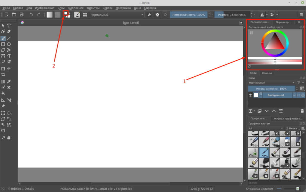 Выбирайте кисть кликнув на квадратик с нужным инструментов. Для смены рабочего цвета рисования нажмите на треугольник Расширенного выбора цвета.