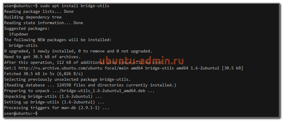 Последний вариант наиболее простой и удобный, поэтому настроим сеть для виртуальных машин таким образом. Для этого нам нужно установить дополнительный пакет на host.