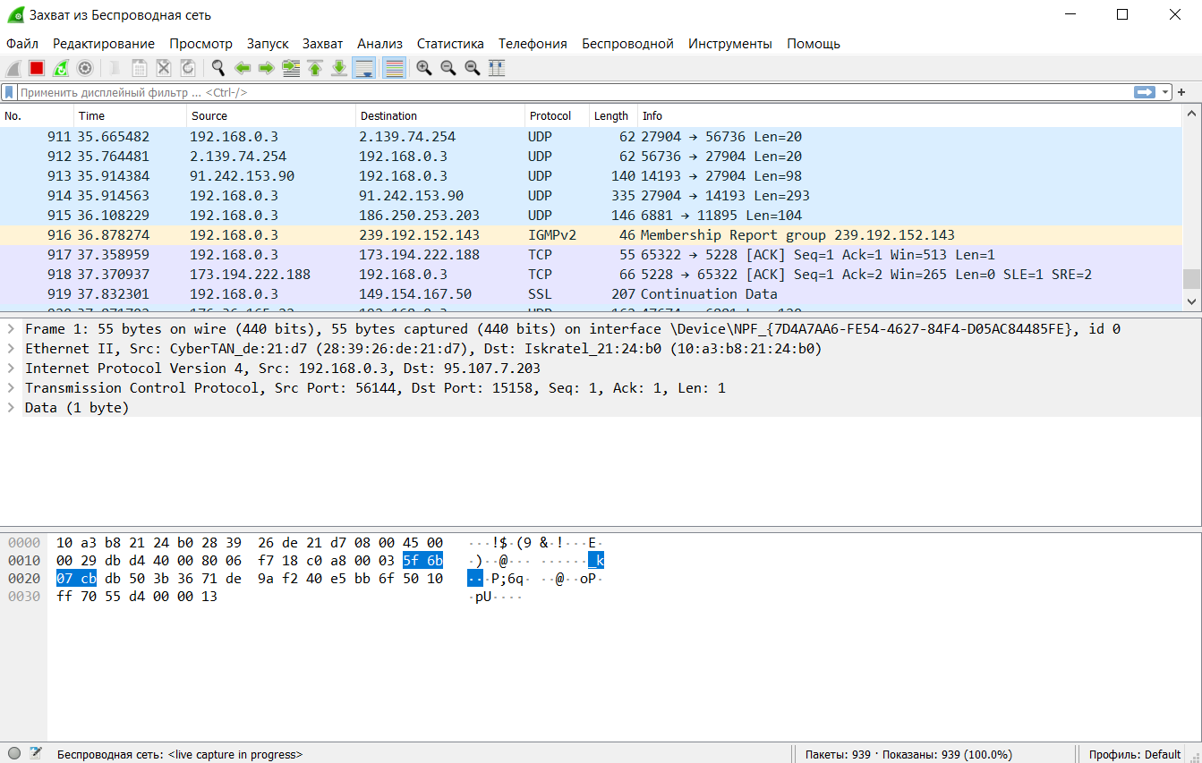 tcp.port == 80 // Фильтрация данных TCP с порта 80 udp.port == 12345 // Фильтрация данных UDP с порта 12345 ip.src == 192.168.0.1 // Фильтруем данные, чей исходный IP-адрес 192.168.0.1 ip.dst == 192.168.0.1 // Передаем данные, чей IP-адрес назначения 192.168.0.1 Вышеуказанные условия фильтрации можно комбинировать с и с или, например tcp.port == 80 и ip.src == 192.168.0.1 // Фильтрация номеров TCP из порта 80 и IP-адреса источника 192.168.0.1 udp.port == 12345 или ip.dst == 192.168.0.1 // Фильтрация данных UDP с порта 12345 или данных, чей IP-адрес назначения 192.168.0.1