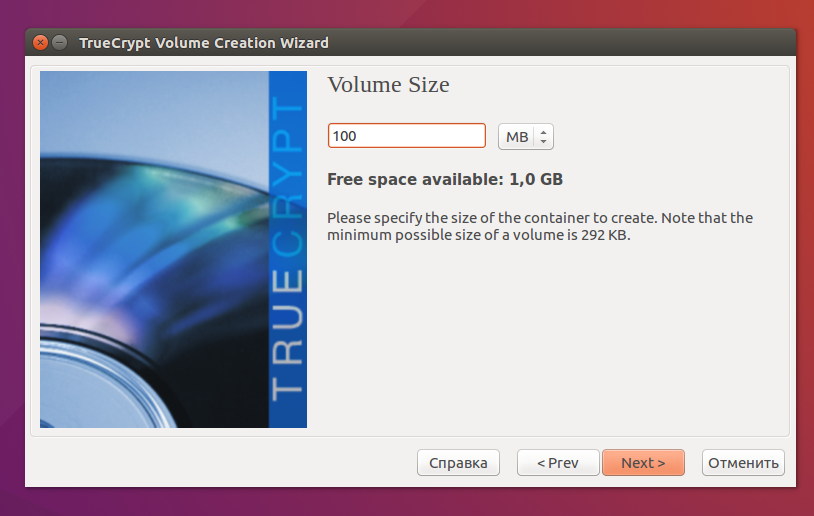 На следующем этапе необходимо задать размер раздела, в котором будут храниться зашифрованные файлы. Данный параметр напрямую зависит от того, сколько и какие файлы вы будете хранить, и подбирается индивидуально.
