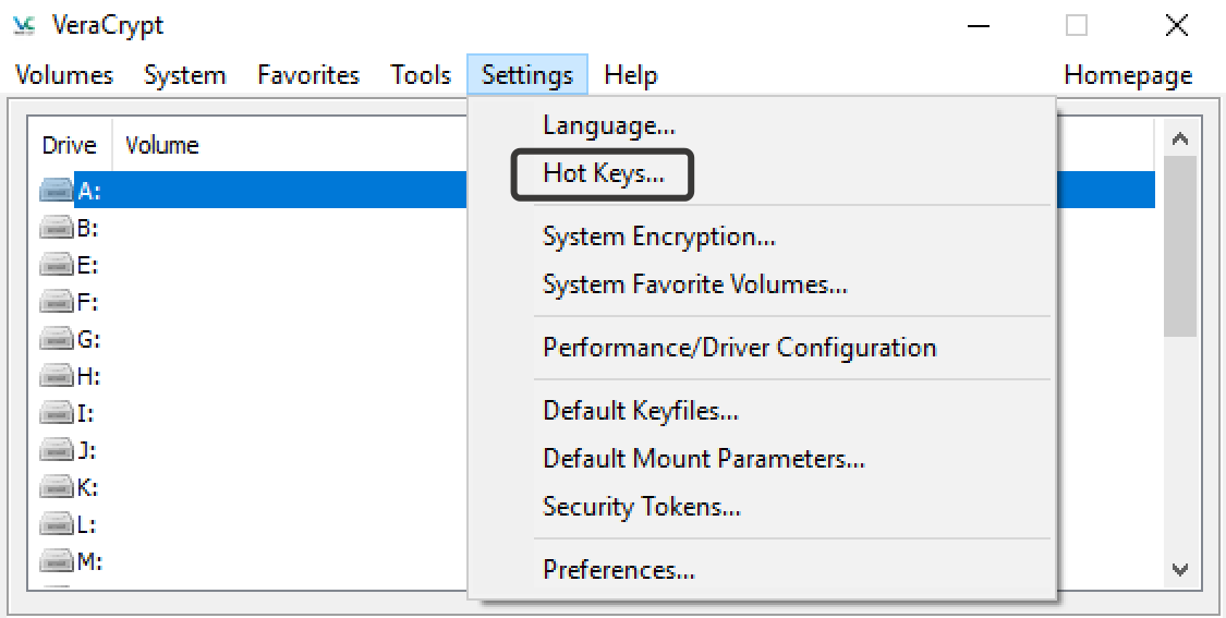 Открываем VeraCrypt или TrueCrypt. Выбираем Settings>Hot Keys…