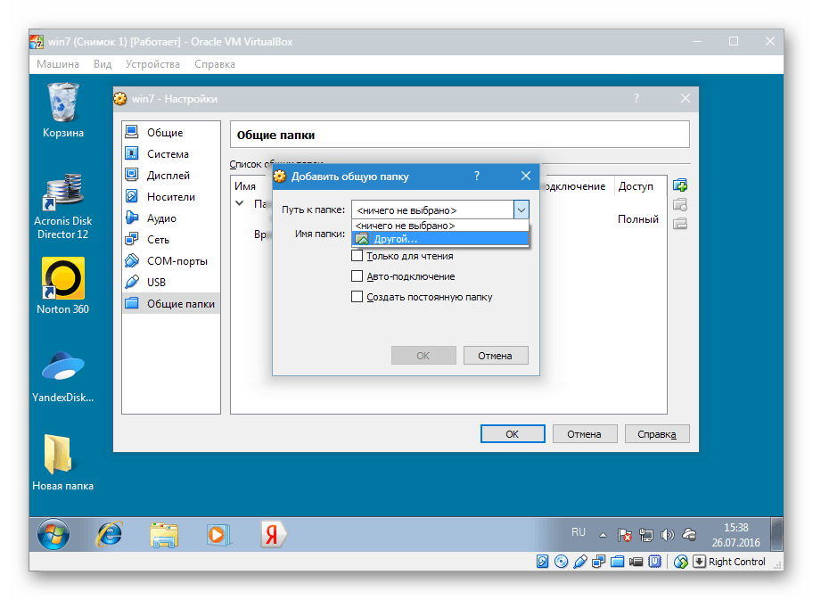 Здесь настраиваются папки, которые будут видны для виртуальной машины. Настройка производится как для обычных общих папок, т.е. нужно просто указать, где открывается доступ другим пользователям, а где — нет. И сохранить выбранные настройки.