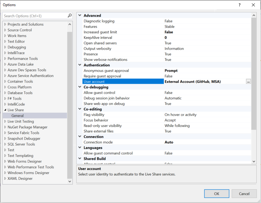 Если вы не хотите использовать для входа учетную запись персонализации Visual Studio, перейдите в раздел Инструменты > Параметры > Live Share > Учетная запись пользователя и настройте другие учетные данные.