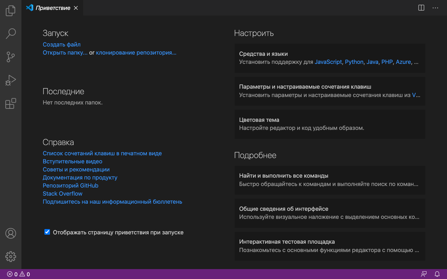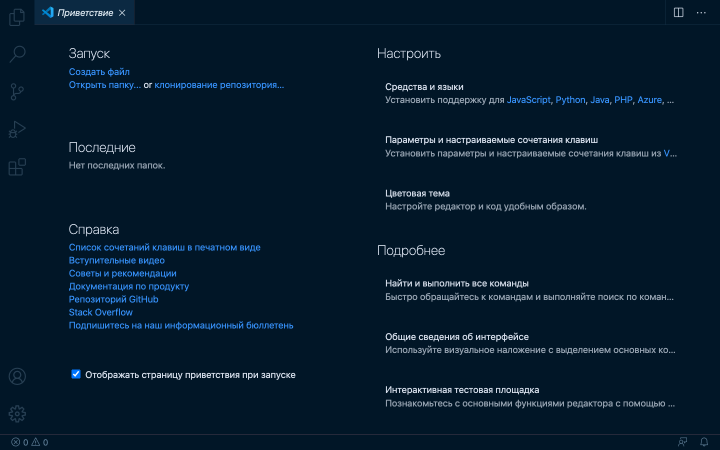 Приветственное окно Visual Studio Code после установки языкового пакета