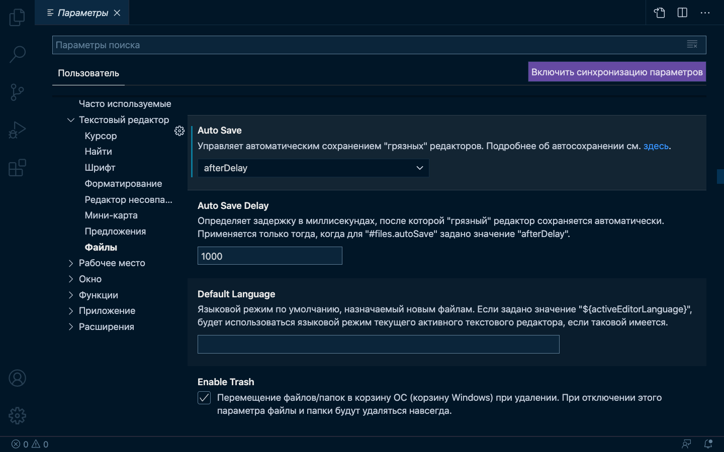 Включаем автосохранение. В боковой панели выберите шестерёнку, перейдите в «Параметры» → «Текстовый редактор» → «Файлы». Вы увидите вкладку Auto Save, в которой нужно указать период сохранения файлов. Мы рекомендуем режим afterDelay с задержкой в одну секунду — так вы будете сразу сохранять всё, что запишете. Если вы выберете режим onFocusChange, то изменения в рабочем файле будут сохраняться каждый раз, когда вы будете открывать другие вкладки редактора. В режиме onWindowChange изменения происходят сразу после того, когда вы сворачиваете VS Code и открываете окна других программ.