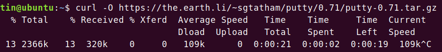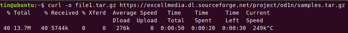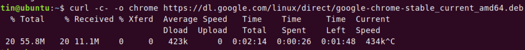 Хотя загружая файл, вы можете вручную приостановить его, используя Ctrl + C , или иногда он автоматически прерывается и останавливается по любой причине, вы можете возобновить его. Перейдите в тот же каталог, в который вы ранее загрузили файл, затем введите команду в следующем синтаксисе:
