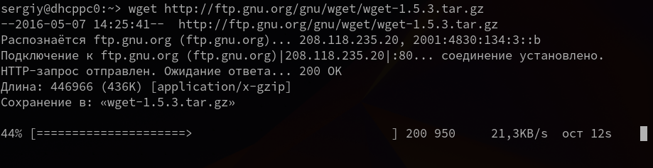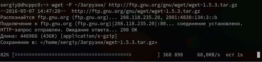 Команда wget linux скачает один файл и сохранит его в текущей директории. Во время загрузки мы увидим прогресс, размер файла, дату его последнего изменения, а также скорость загрузки:
