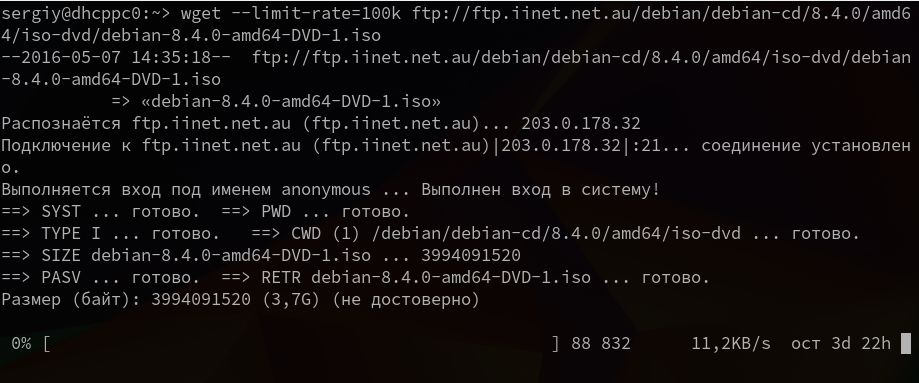 Команда wget linux позволяет не только продолжать загрузку файлов, но и ограничивать скорость загрузки. Для этого есть опция —limit-rate. Например ограничим скорость до 100 килобит: