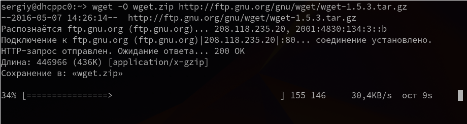 Опция -О позволяет задать имя сохраняемому файлу, например, скачать файл wget с именем wget.zip: