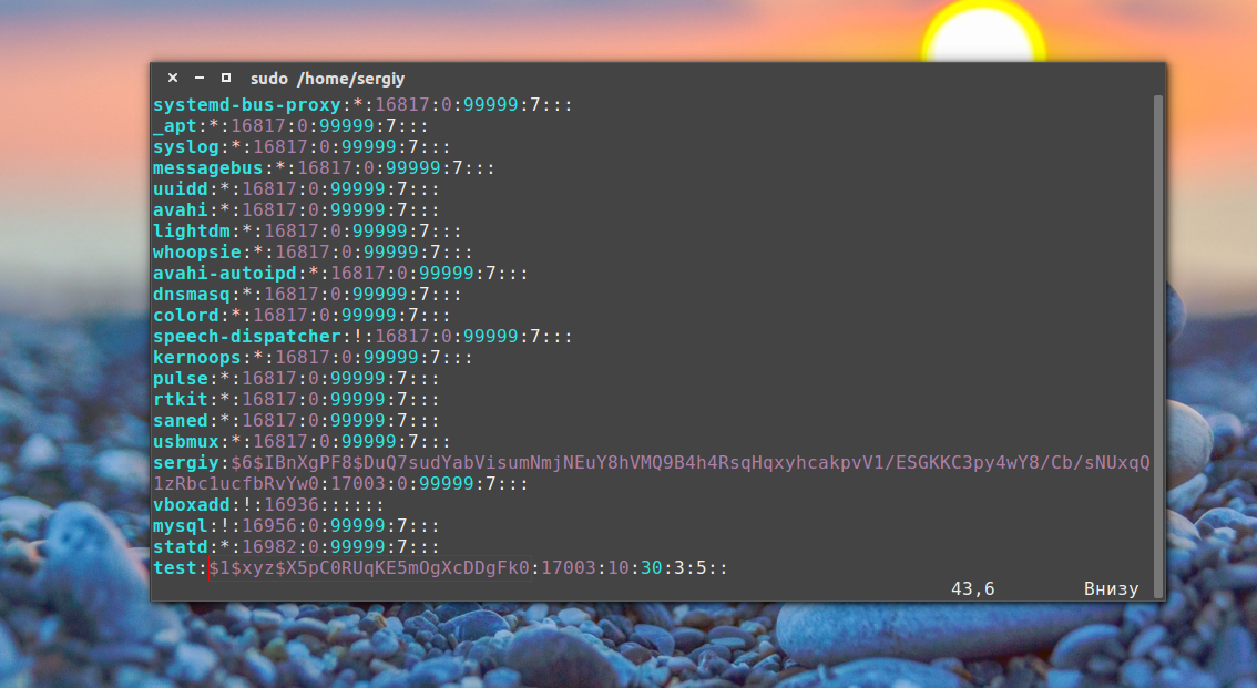 Скопируйте полученный результат в буфер обмена, затем откройте файл /etc/shadow и найдите там нужного пользователя. Я хочу сменить пароль Linux для test: