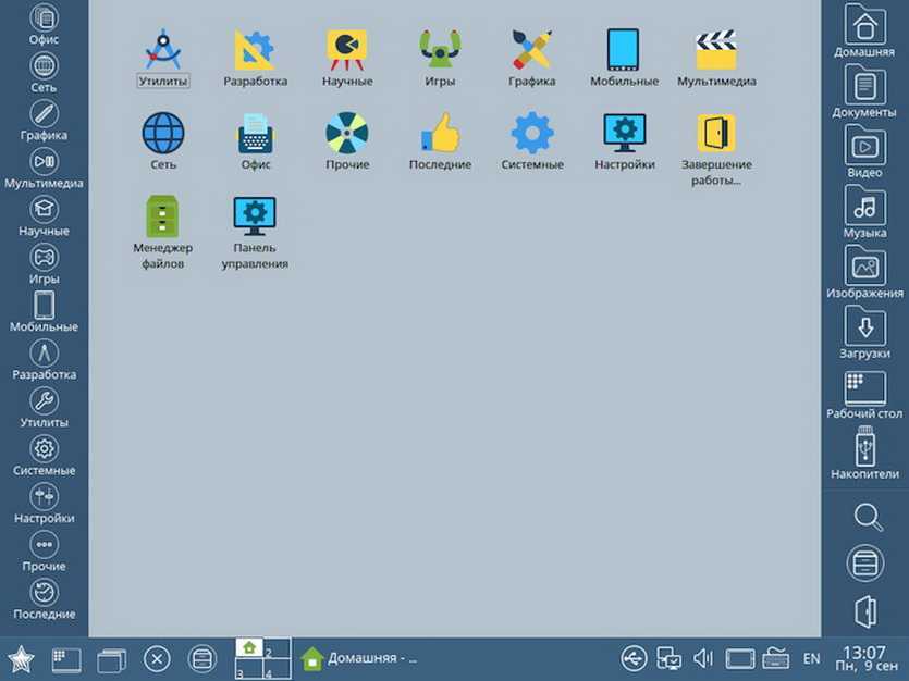 Пользователю предлагается 4 готовых рабочих стола, на каждом из которых сгруппирован набор значков для доступа к набору программ конкретного назначения.
