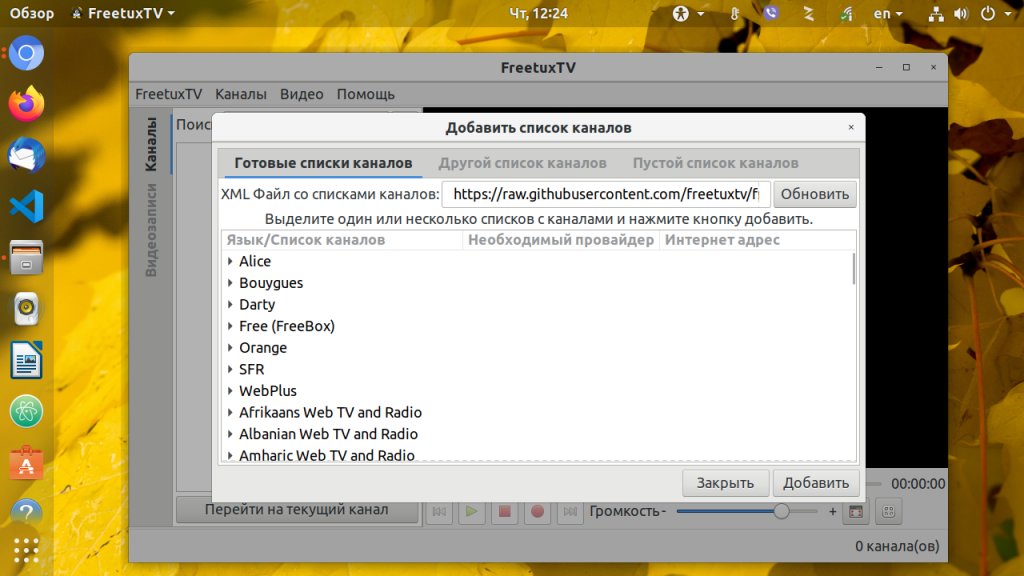 При первом запуске FreeTuxTV предложит выбрать каналы, которые вам интересны. Каналы сгруппированы по языкам. Здесь вы можете найти и русские каналы, но многие из них не работают. Выберите нужные каналы и нажмите кнопку Добавить: