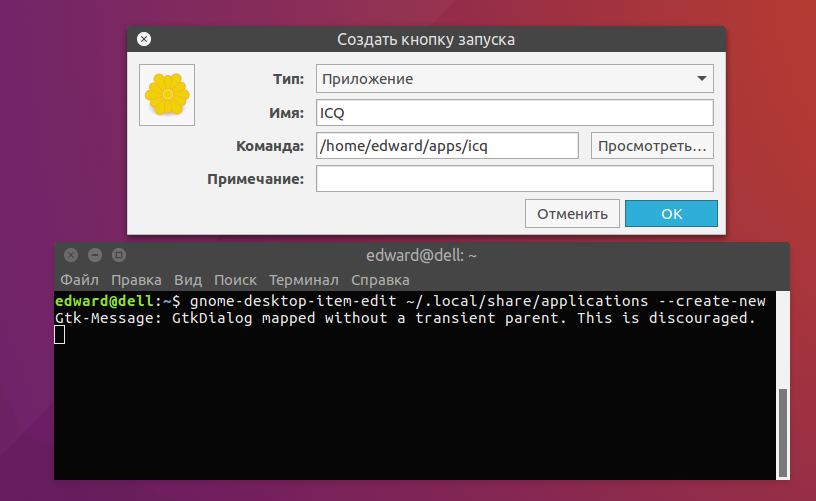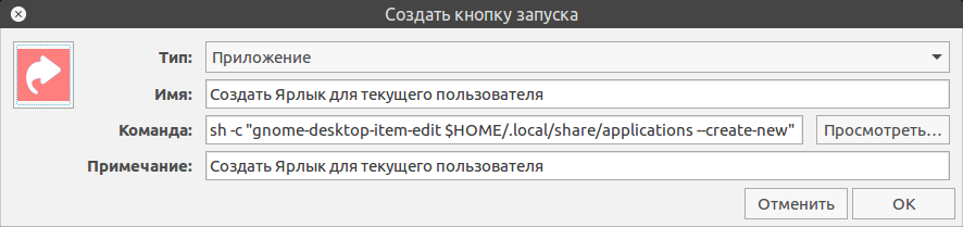 И теперь, если мы хотим создать ярлык для приложения или запуска скрипта, то нам не надо создавать никакие текстовые файлы или использовать терминал. Всё делается через графический интерфейс.