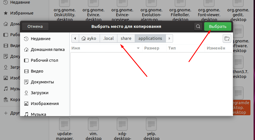 Указываем в новом окне путь «Домашняя папка», репозиторий «.local», затем «share» и «applications». Выбираем эту папку нажатием на зеленую кнопку в правом верхнем углу, и в результате на панели задач «Избранное» появится ярлык данного приложения.