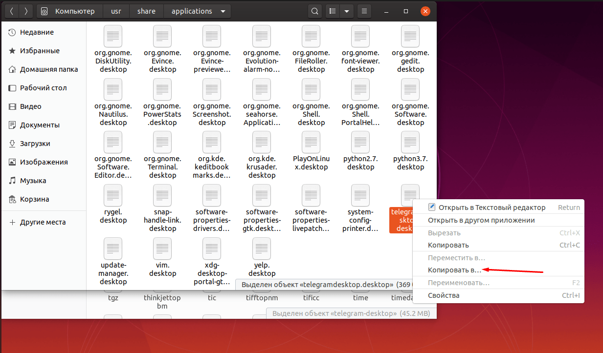 Эту же операцию можно произвести другим путем – переходим в репозиторий /usr/share/applications, находим в списке элемент «telegramdesktop.desktop», жмем по иконке правой кнопкой мыши и выбираем пункт «Копировать в…».
