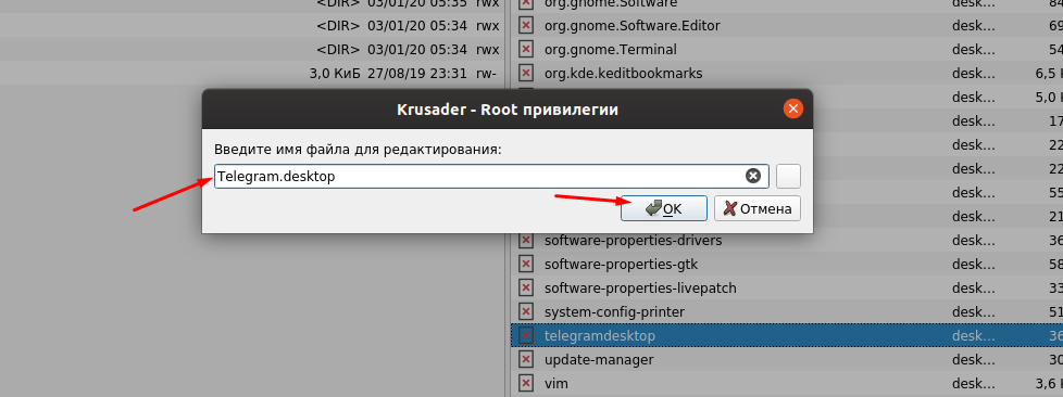 Вводим название будущего файла, в нашем случае выглядеть он будет как «Telegram.desktop», после нажимаем на кнопку ОК.
