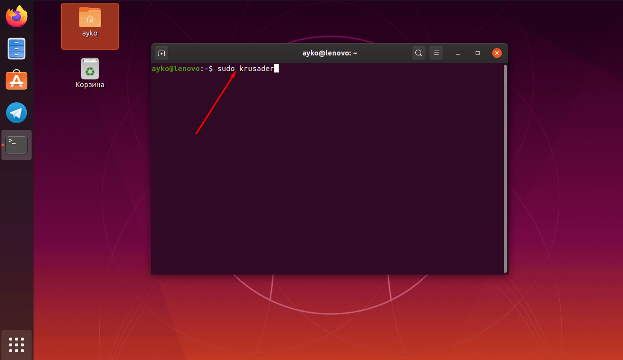 Открываем программу Krusader от имени администратора через консоль «Терминал»