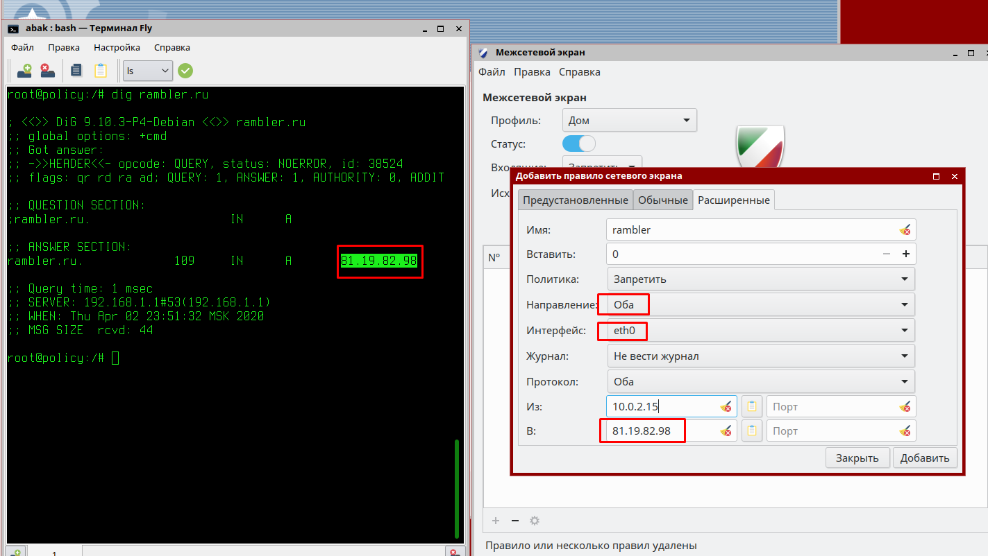 - Создать расширенное правило c запретом передачи данных в оба направления для сетевого интерфейса eth-N, для чего: