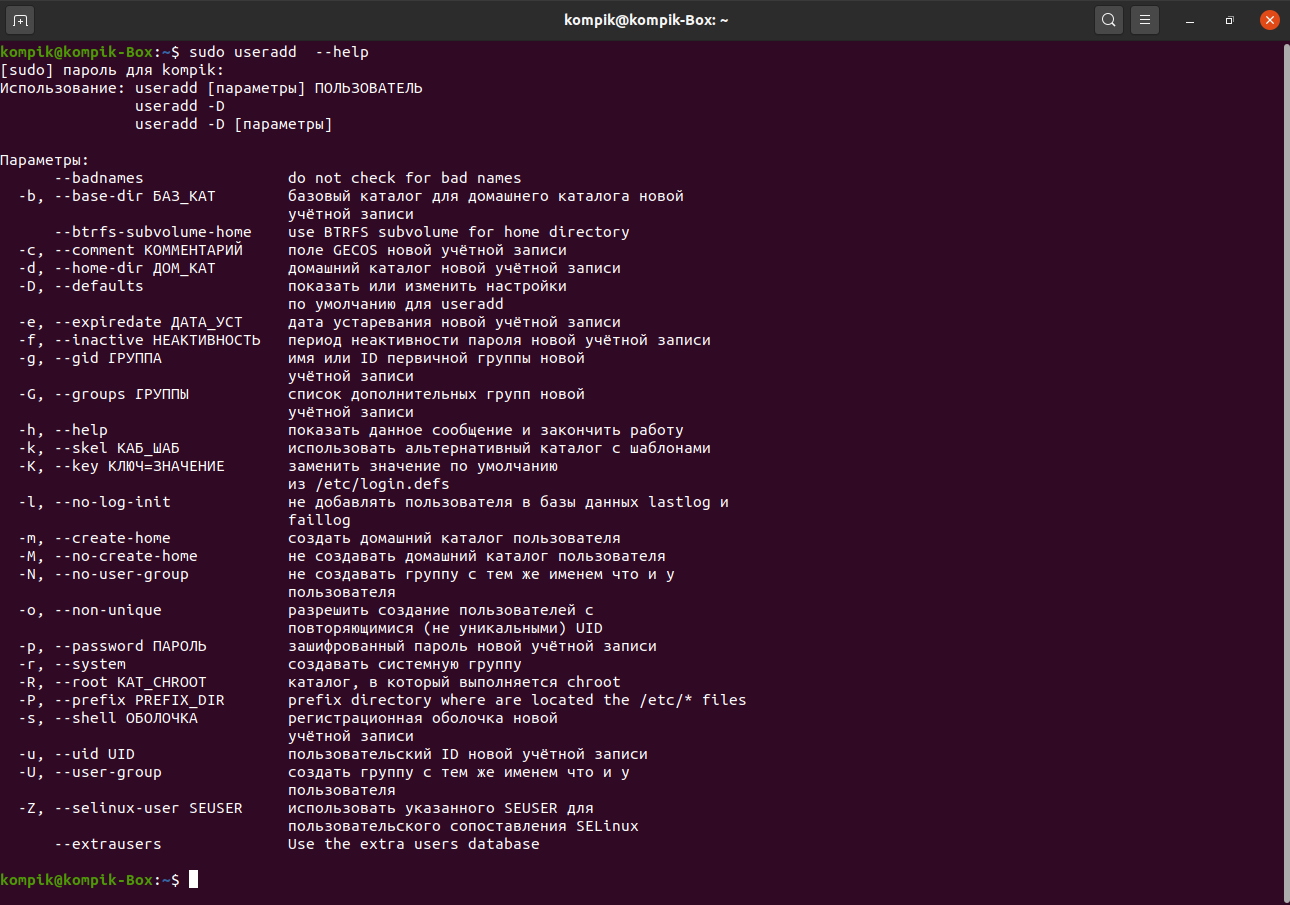 Для создания пользователя в Linux используется команда useradd, если вы откроете ее справку командой useradd —help, где —help является ключом, то в терминале будет выведен полный набор поддерживаемых данной командой ключей.